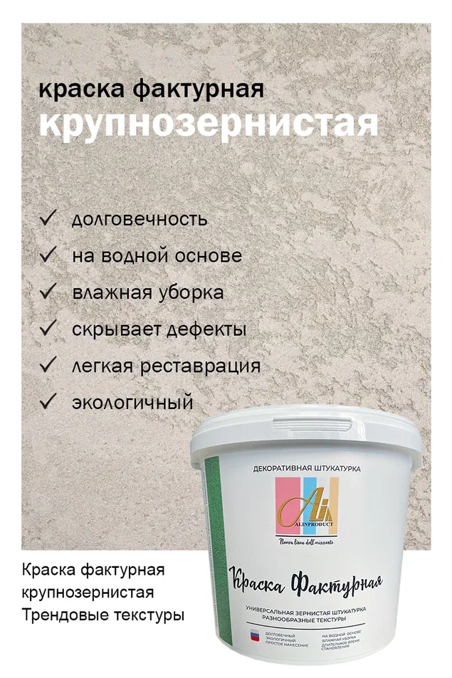 Краска представляет собой вязкую, грубодисперсную однородную массу на акриловой основе для внутренних работ. Позволяет получать рельефное покрытие толщиной до 3 мм, скрывающее мелкие дефекты.